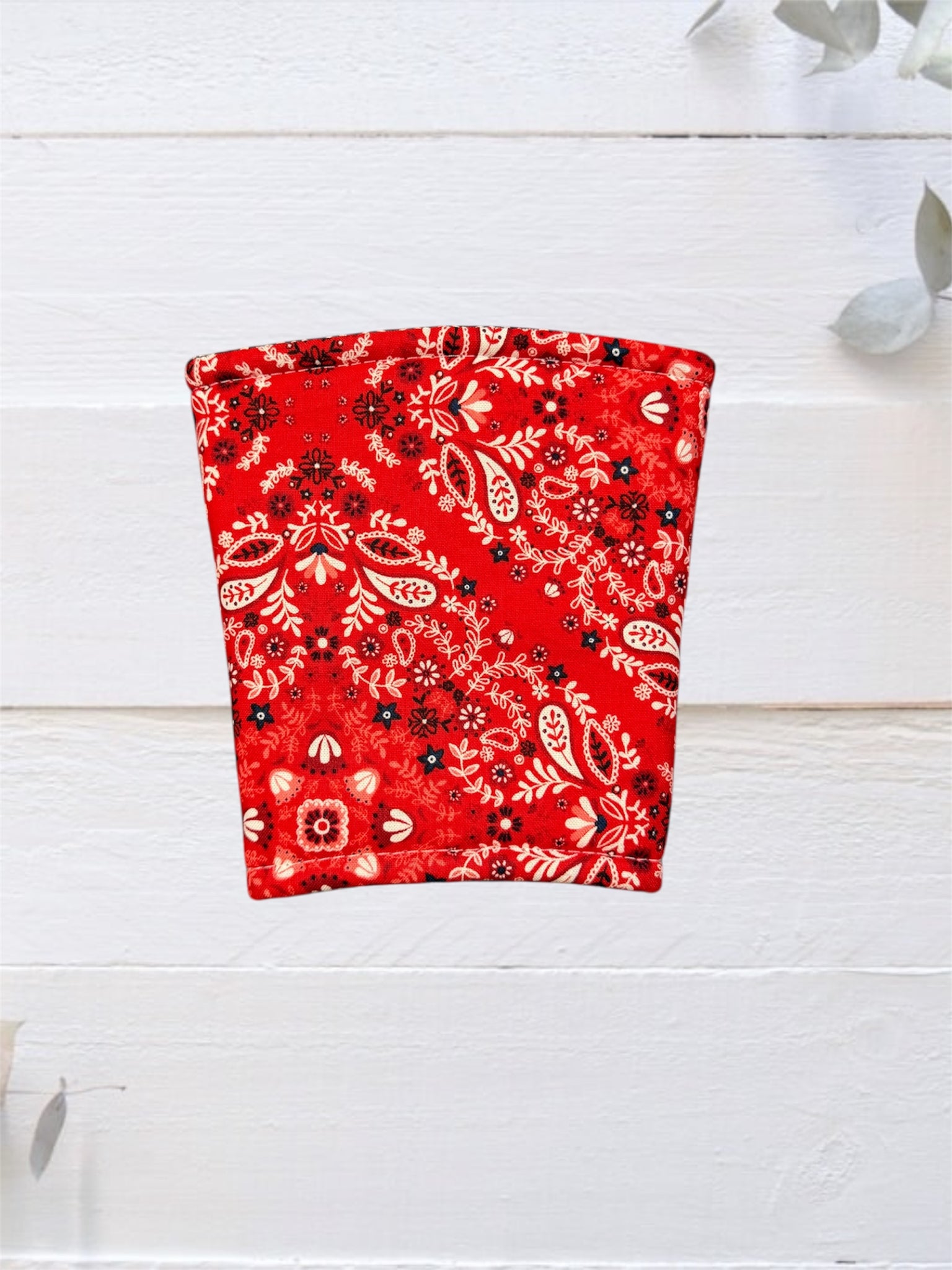 Each cup cozy is made in my home studio with premium cotton fabrics and insulated material in between the beautiful cotton fabrics to keep your drinks cold.